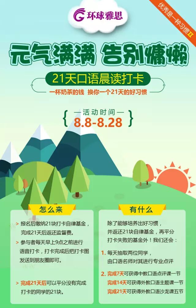 A:向雅思小姐姐(对对对就是我)报名后,21天里,每天早上九点之前,用语音的形式读一段英语给我进行打卡就可以啦!语音时长在一分钟以上。内容只要是英语就行,也可以是我选一段英文给你。